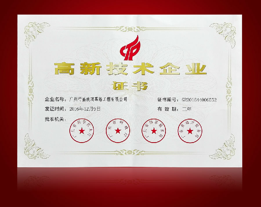 经国家科技部、财政部、国家税务总局专家评审,行盛集团旗下广州行盛玻璃幕墙工程有限公司获得了由广东省科学技术厅、广东省财政厅、广东省国家税务局、广东省地方税务局联合颁发的《高新技术企业证书》,我司荣获“高新技术企业”称号。公司此次能够顺利获得高新技术企业的称号,反映了广东省有关部门对我司经营成果及科技创新的认可。