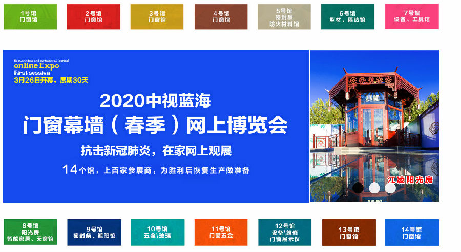 中视蓝海门窗幕墙(春季)网上博览会包括:门窗馆;密封胶、防火材料馆;型材、隔热馆;设备、工具馆;阳光房、智能家居、天窗馆;密封条、遮阳馆;建筑玻璃、间隔条馆;门窗五金馆;设备、门窗展示仪馆;五金配件馆等14个展馆。