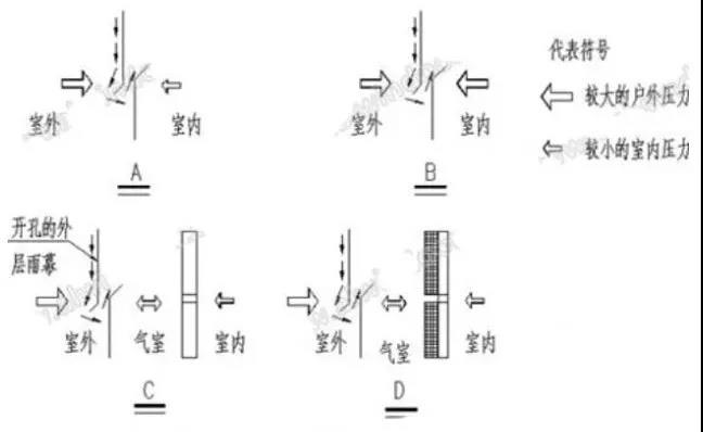 雨幕原理假定墙体外表面为一层"幕",研究如何阻止雨水或雪融水透过这层幕的机理。它的研究范围包括:缝隙或孔洞影响、重力作用、毛细作用、表面张力的影响、风运动能的影响、压力差的作用等。据此开发出合理的解决方案,达到成功阻止水渗漏的目的。